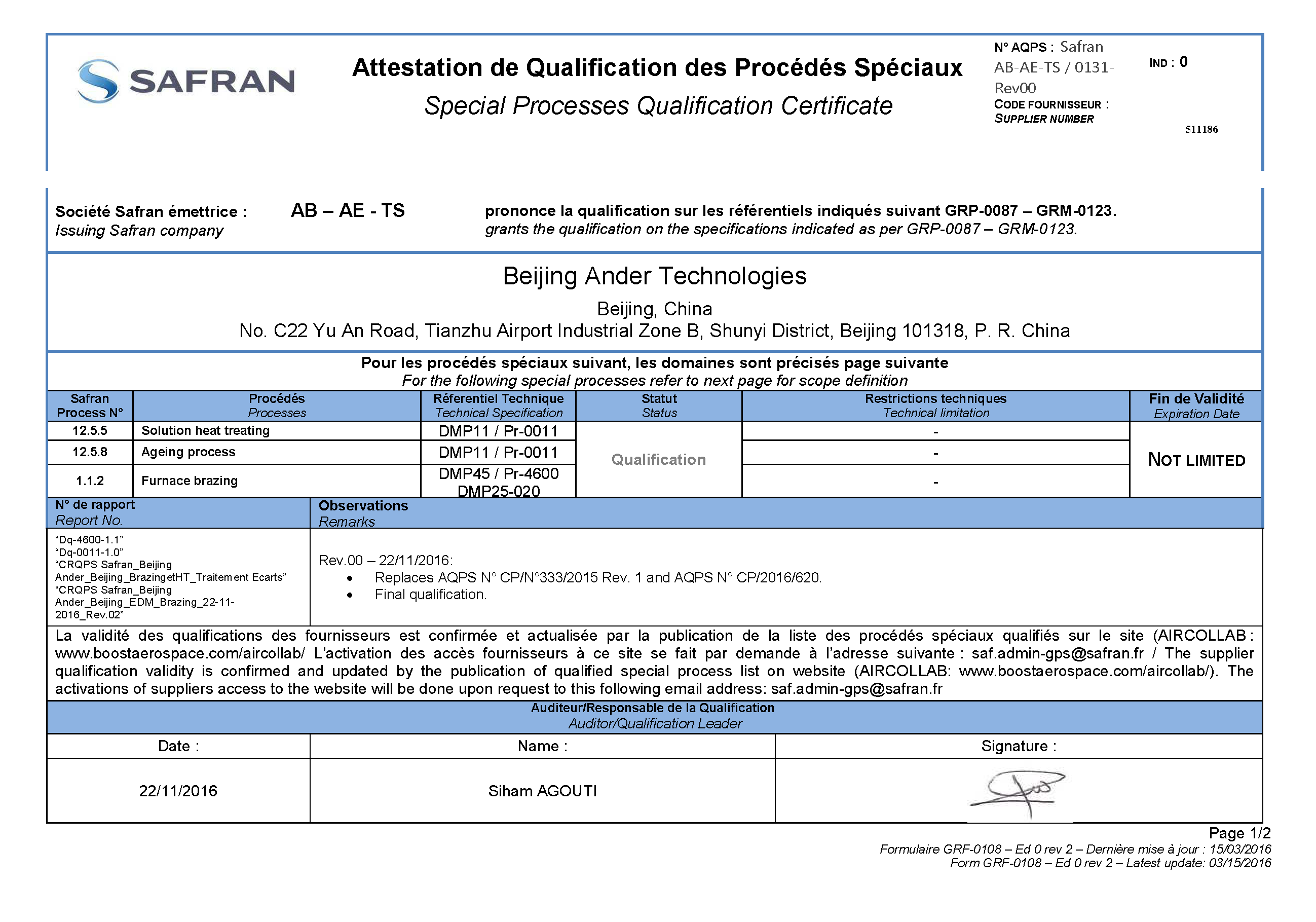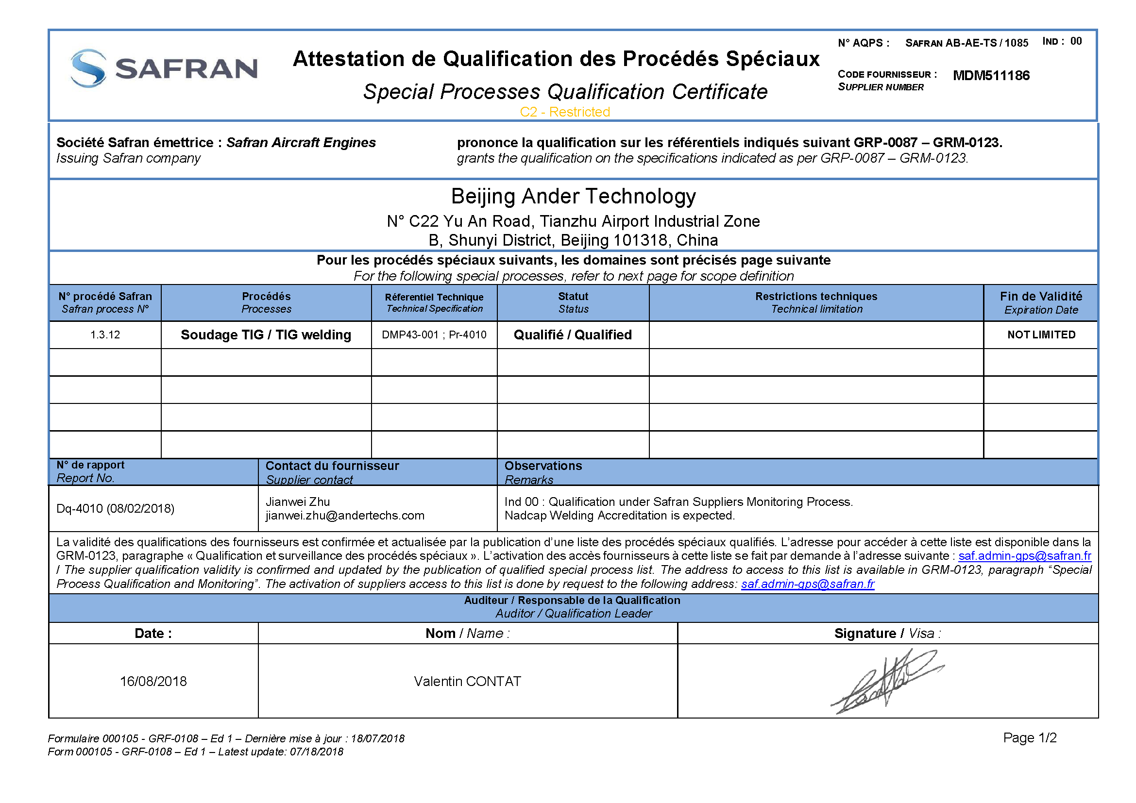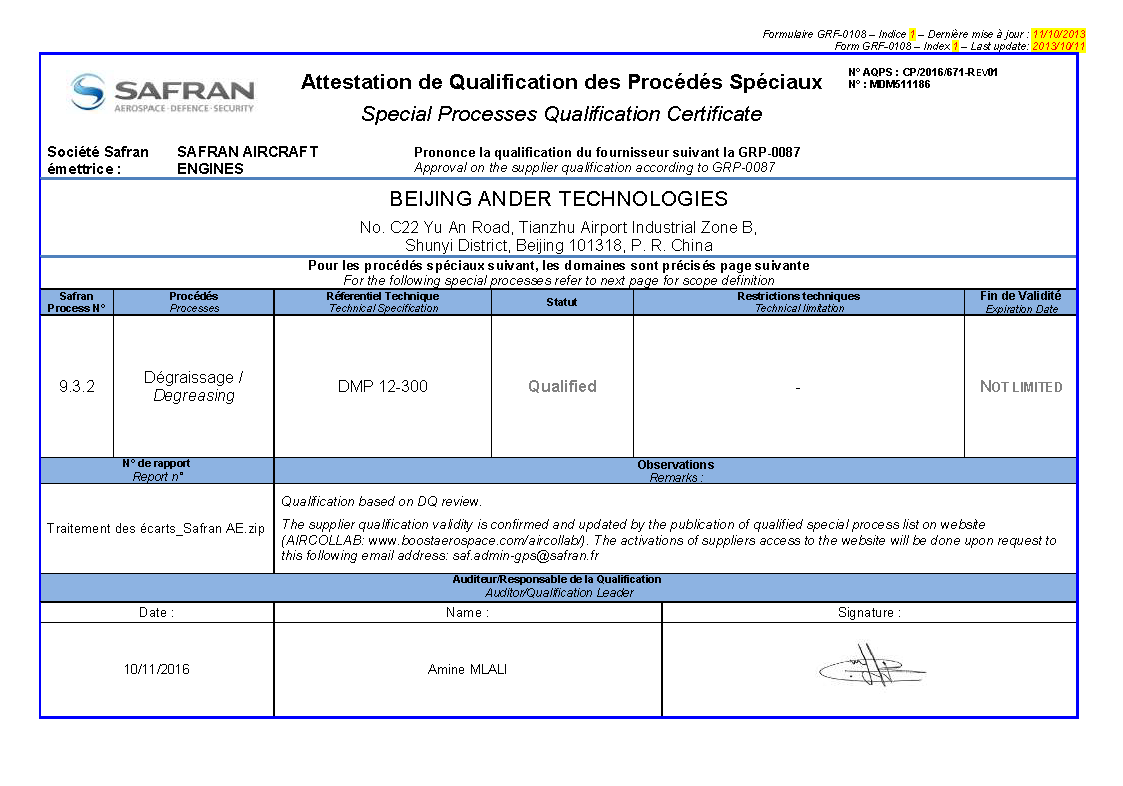 北京安达泰克公司通过赛峰集团(Safran)严格审核,获得钎焊与热处理(Brazing & Heat Treating)、、TIG焊接(TIG Welding)、电火花加工(EDM)、荧光渗透检测(FPI)、激光切割(Laser Cutting) 等核心工艺认证。该认证标志着我们的特殊过程制造与检测能力完全符合赛峰航空发动机、起落架及机载设备的高标准要求,成为其全球供应链的可靠合作伙伴