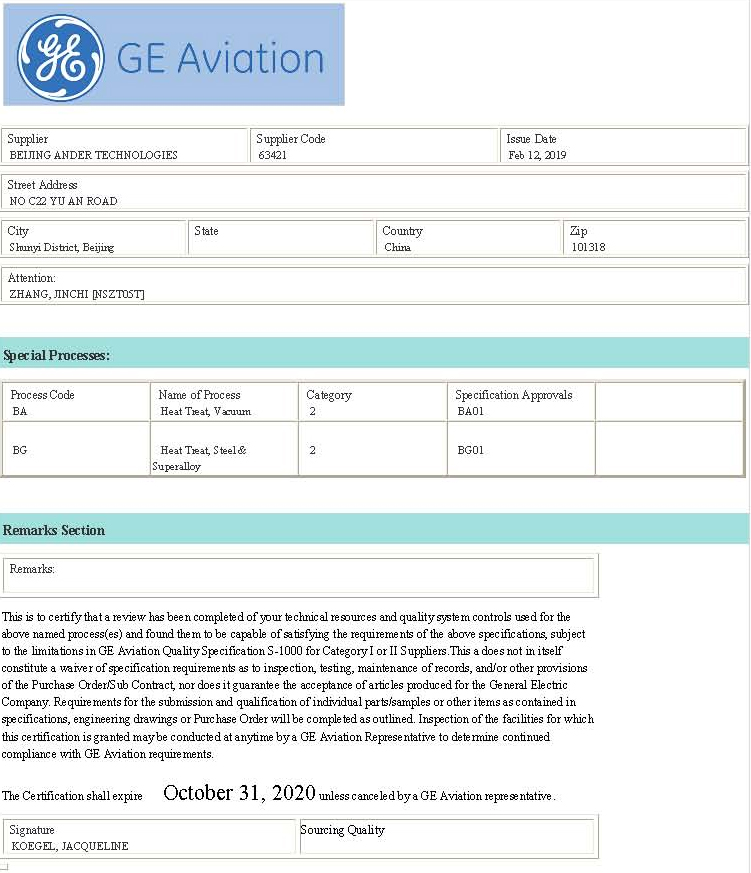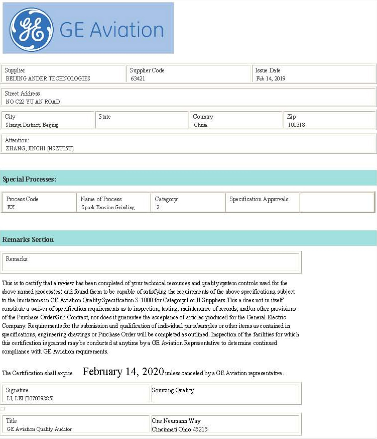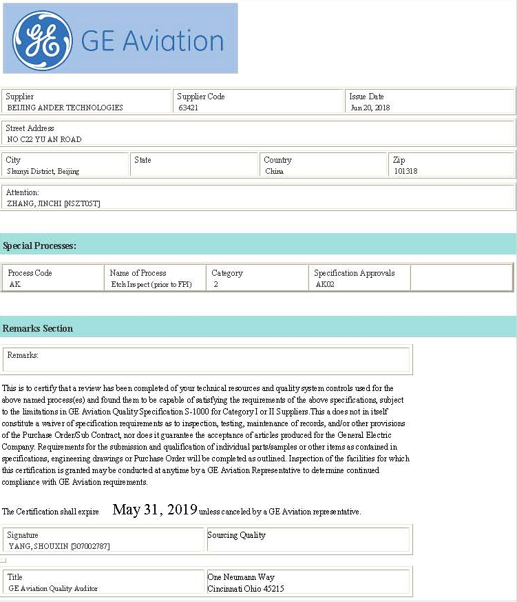 北京安达泰克公司通过 GE Aviation 严格审核,获得 热处理(Heat Treat)、钨极氩弧焊(GTAW)、非传统加工(Nonconventional Machining)、荧光渗透检测(FPI)、擦拭腐蚀(Swab Etch)、振动光饰(Tumble)、金属材料实验室认证(S-400)等核心工艺认证。此认证代表我们的制造与检测体系已满足全球航空发动机巨头 GE Aviation 对安全性、可靠性和一致性的极致要求,成为其值得信赖的供应链合作伙伴。
