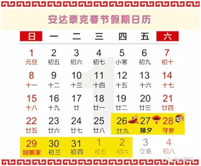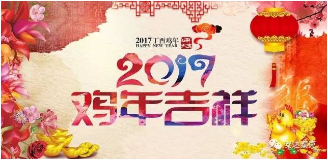 今天是农历腊月廿八,明天将是安达泰克鸡年春节假期的开始。值此丁酉鸡年来临之际,谨向各位员工及家属,我们的客户、供应商、合作伙伴,关心和帮助我们的朋友们拜个早年,送上春的良好祝福与节日的诚挚问候!