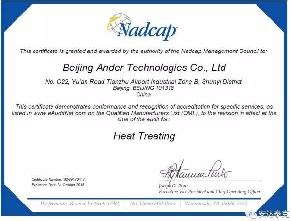 同时,业绩评审协会PRI的执行副总裁及首席营运官Joe Pinto先生也发来贺词“祝贺北京安达泰克科技有限公司成功通过可能是航空行业最严格的过程能力评估审核,Nadcap审核标准是公认的难以满足的,并且北京安达泰克科技有限公司这样满足审核标准并正当地获得认可的企业,也是广泛被承认的”。