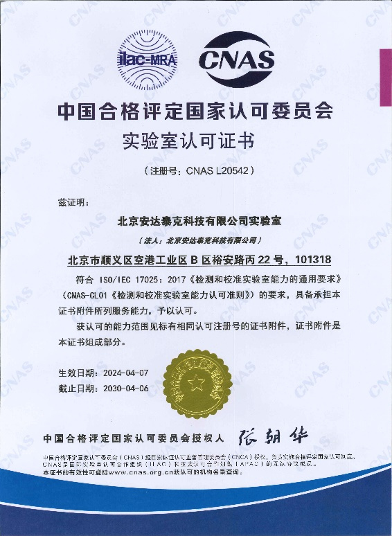 北京安达泰克科技有限公司实验室通过中国合格评定国家认可委员会(CNAS)的严格评审,获得国家级实验室认可资质。这标志着安达泰克的检测能力、质量管理体系及技术实力均达到国际标准(ISO/IEC17025:2017),出具的检测报告具有国际公信力,在全球100多个国家和地区获得互认。